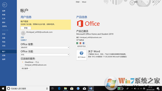 9、我們點(diǎn)擊左上角“文件”-“賬戶”,就要中以看到顯示“產(chǎn)品已激活”,不過(guò)會(huì)發(fā)現(xiàn)左側(cè)提示賬戶錯(cuò)誤,點(diǎn)擊修復(fù),輸入微軟賬戶的信息,提示完善微軟賬戶信息:姓名,維護(hù)完畢,確認(rèn)后正常。
