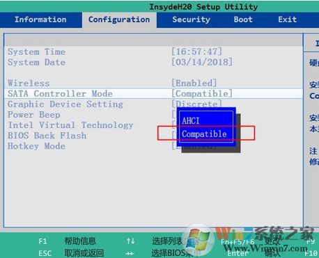 2、在BIOS中,按→方向鍵移去往Configuration,挑選SATA Controller Mode回車鍵,挑選Compatible,回車鍵,最終按F10儲(chǔ)存重新啟動(dòng)。