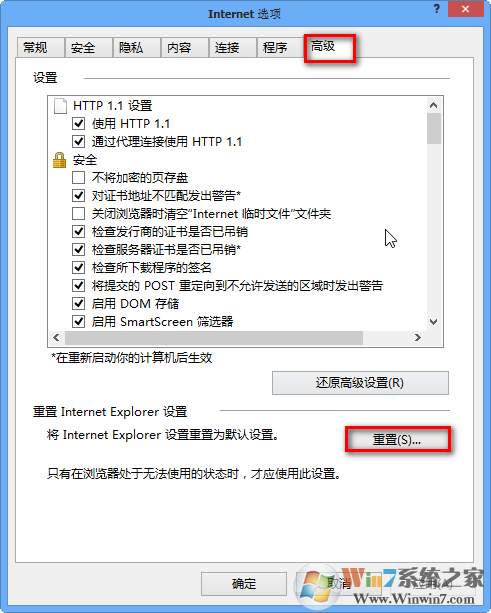 2、切換到找到高級選項卡--點擊重置按鈕