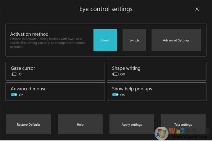 顯示眼球控制設(shè)置:你可以選擇激活方法,并啟用注視光標(biāo),形狀書寫,高級(jí)鼠標(biāo)和顯示幫助彈出窗口等。