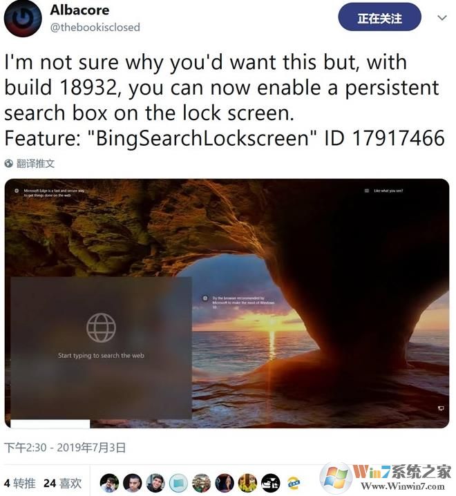 Windows黑客開發(fā)者Albacore,該Windows 10 20H1版本具有在主鎖屏屏幕上啟用Bing搜索框的功能。并且其設(shè)計(jì)采用了流暢設(shè)計(jì)中的高斯模糊背景,下面是搜索框。還提到了“BingSearchLockscreen”ID 17917466的信息。