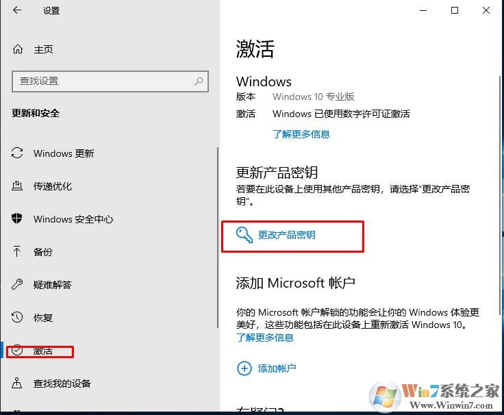 2、點(diǎn)擊激活,然后在右側(cè)點(diǎn)擊【更改產(chǎn)品密鑰】;