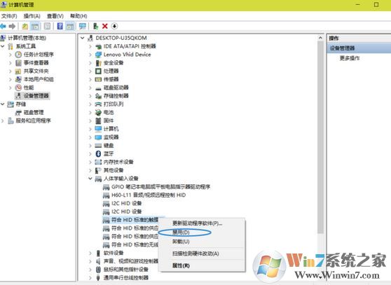第三步:若后期想繼續(xù)使用,可右鍵單擊這個(gè)設(shè)備—啟用;若萬一無法啟用或者觸摸屏功能失靈可嘗試卸載此設(shè)備-右鍵單擊任一設(shè)備掃描檢測硬件改動。