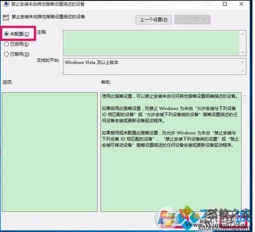 8、我們點擊應(yīng)用-確定以后,在本地組策略編輯器中,禁止安裝未由其他策略設(shè)置描述的設(shè)備選項為“未配置”,退出本地組策略編輯器。