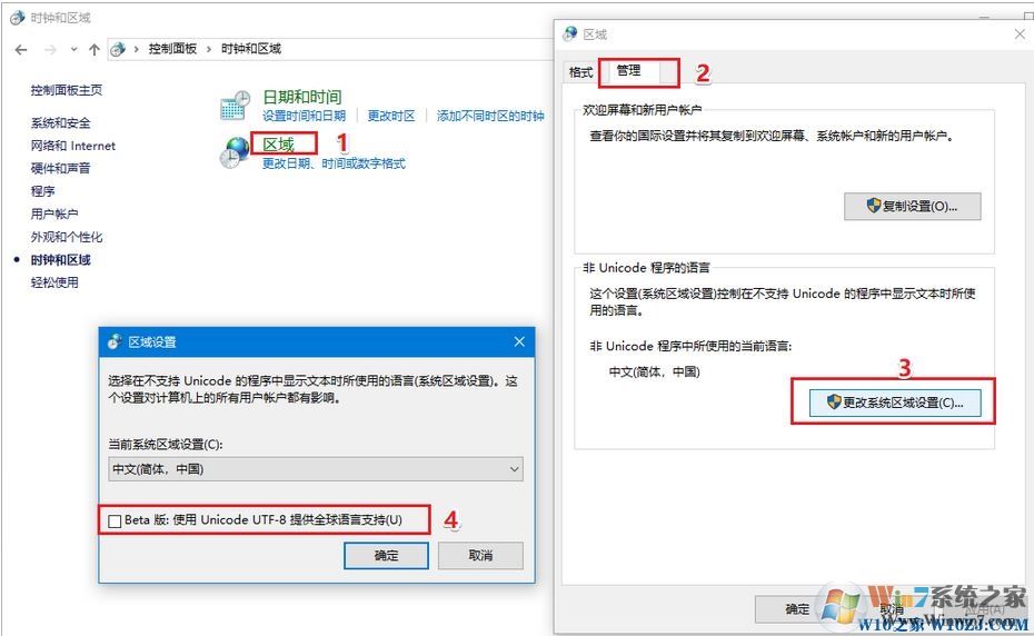 2、輸入control回車打開控制面板>時鐘和區(qū)域>區(qū)域>管理>更該系統(tǒng)區(qū)域設置>勾選"Beta 版: 使用 Unicode UTF-8 提供全球語言支持" 。