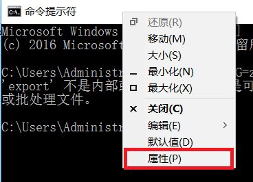 2、window的命令行界面,在頂部空白處右擊,選擇屬性,如圖: