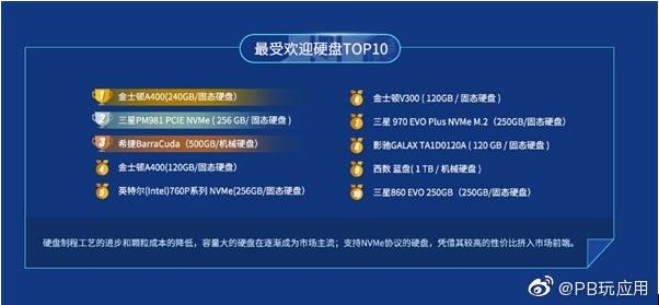 最受歡迎的十款硬盤中,大容量、NVMe也成為流行趨勢。拔得頭籌的是高性價比的金士頓A400 240GB,類似的A400 120GB、V300 120GB也都上榜。
