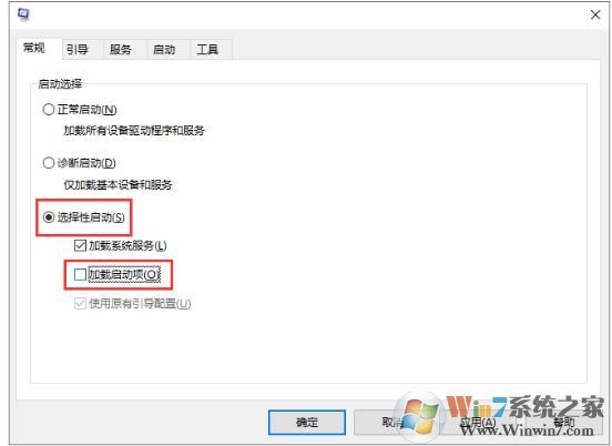 2. 選擇“選擇性啟動(dòng)”,去除“加載啟動(dòng)項(xiàng)”復(fù)選框;
