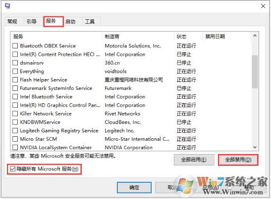 3. 在“服務(wù)”選項(xiàng)卡下,首先勾選“隱藏所有Microsoft服務(wù)”,然后點(diǎn)擊“全部禁用”按鈕;