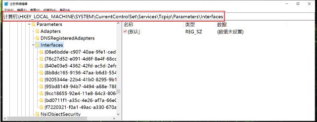 2. 定位到以下路徑“HKEY_LOCAL_MACHINE\SYSTEM\CurrentControlSet\Services\Tcpip\Parameters\Interfaces”;