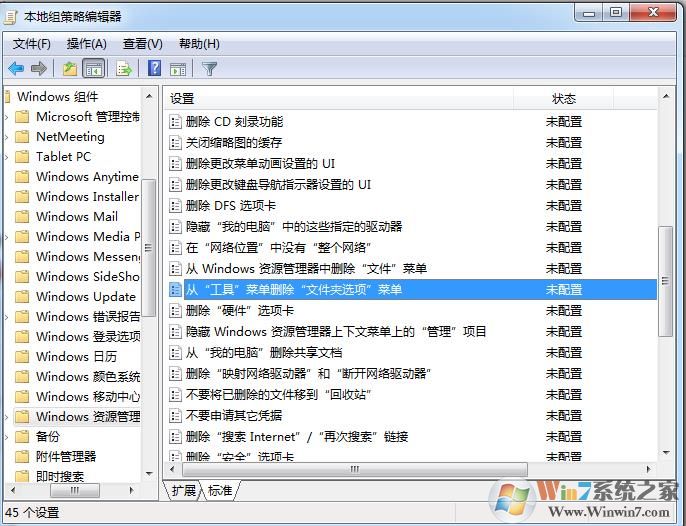 3、然后在右側窗口中找到“從‘工具’菜單刪除‘文件夾選項’菜單”選項,鼠標雙擊打開該選項,