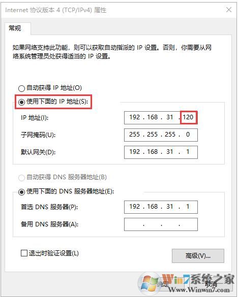 8. 點(diǎn)擊“使用下面的IP地址”后,填寫一個(gè)新的IP,之前記錄了老IP,新IP只需要最后的數(shù)字不同即可,子網(wǎng)掩碼默認(rèn)255.255.255.0,默認(rèn)網(wǎng)關(guān)不可更改,在之前的屬性信息里有。下方的DNS,如果路由器提供此服務(wù)可以填入網(wǎng)關(guān)地址,如果沒(méi)有可以從網(wǎng)上搜索DNS服務(wù)器的地址填入。