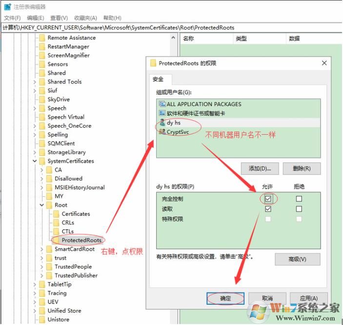 右鍵點(diǎn)權(quán)限,(如果有彈窗,點(diǎn)重新排序,不是每臺(tái)電腦都會(huì)遇到),把所有用戶名(下圖4個(gè))都設(shè)置成完全控制權(quán)限,點(diǎn)確定,右鍵ProtectedRoots,點(diǎn)刪除,如下圖,如果還不行,看步驟2