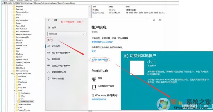 2、如果無(wú)法刪除,需要點(diǎn)控制面板,點(diǎn)“賬戶”,點(diǎn)“改用本地賬戶登陸”,然后注銷(xiāo),再按照上面的步驟刪除,如果還不行,看步驟3