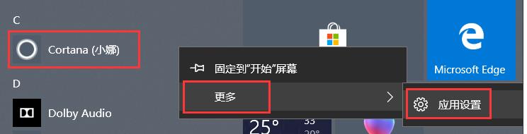 1、點(diǎn)擊開始菜單,找到小娜(Cortana),在小娜上單擊右鍵,選擇【更多】–【應(yīng)用設(shè)置】;