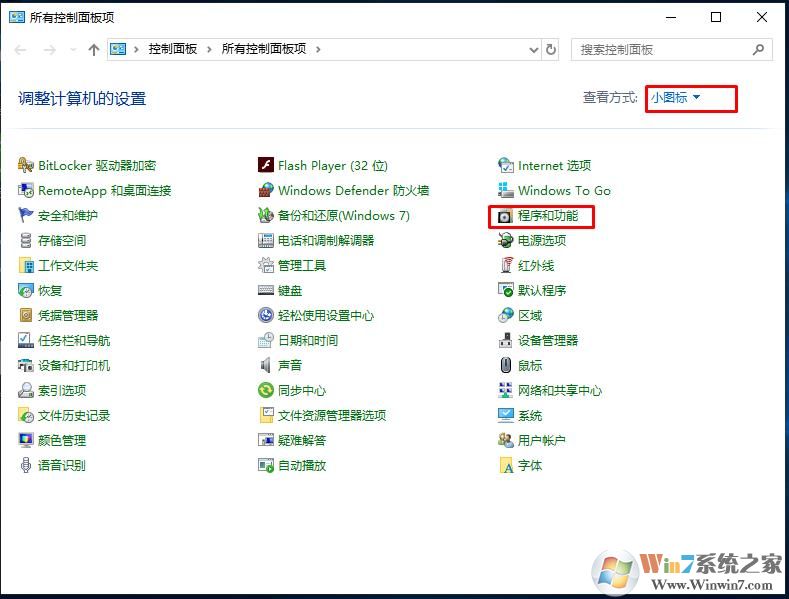 2、來(lái)到控制面板,選擇查看方式為小圖標(biāo),然后點(diǎn)擊程序和功能;