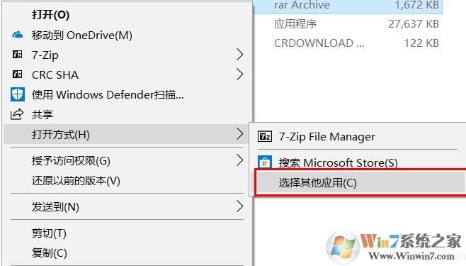 最后,隨便選取一個(gè)文件,右擊找到“打開(kāi)方式”選擇其它應(yīng)用,選中“7-Zip File Manager”