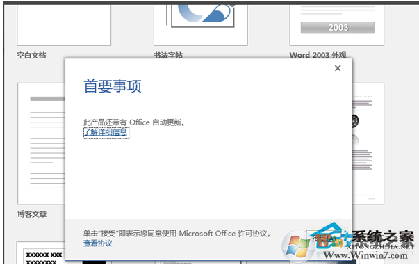 4、打開Office的某個應(yīng)用,這時它會提示我們輸入你的產(chǎn)品密鑰,直接關(guān)閉這個窗口,在接下來的彈出窗口中點擊【接受】,這時,我們的Office就完成了激活工作。