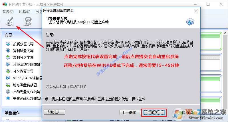 5、最后是點擊完成按鈕然后再點擊左上角的提交按鈕就會自動重啟,重啟后自動進入WINRE模式進行對拷。