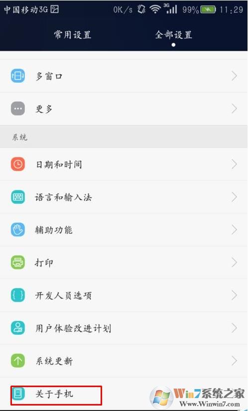 2、然后在設(shè)置中切換到全部設(shè)置,在最下方可以找到關(guān)于手機(jī)。