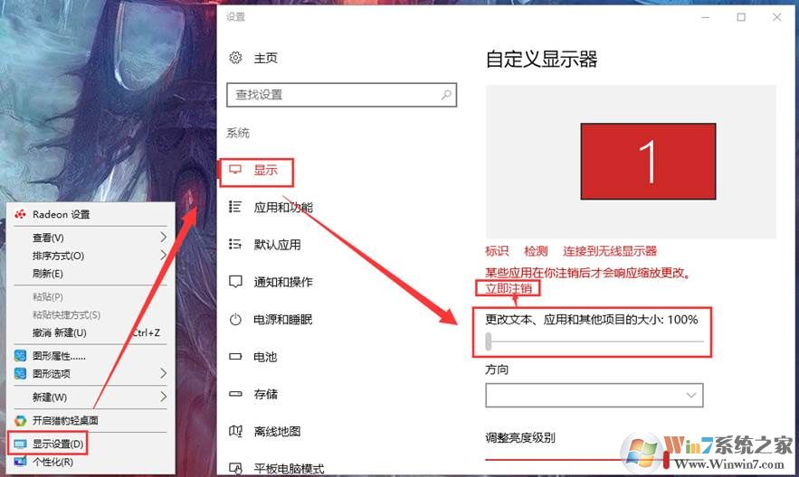 1、在桌面空白處右擊打開(kāi)“顯示設(shè)置”--將更改文本、應(yīng)用和其他項(xiàng)目的大小改為100%--然后點(diǎn)擊立即注銷重啟即可生效。