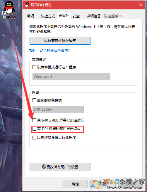 2、為了防止高分辨率下一些軟件自動(dòng)調(diào)整DPI,那么我們還需要:右鍵點(diǎn)擊軟件圖標(biāo)屬性→選擇兼容性→勾選高DPI設(shè)置時(shí)禁用顯示縮放。
