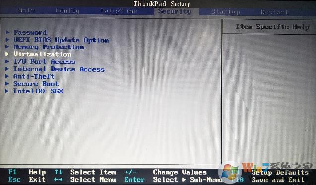 2、在上面點擊到“Security”,看到如下選項,選擇"Virtualization"