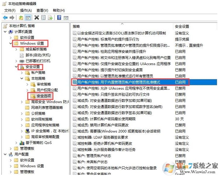 3、組策略中用戶(hù)帳戶(hù)控制:用于內(nèi)置管理員帳戶(hù)的管理員批準(zhǔn)模式被設(shè)為:已啟用,設(shè)為已禁用即可。