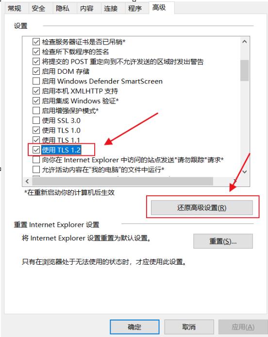 2、同時請您嘗試 Win + R 鍵輸入 inetcpl.cpl 打開設置,然后點 “高級”,往下拉,勾上 "使用 TLS 1.2" 選項,或者點還原高級設置,看看是否能夠解決。