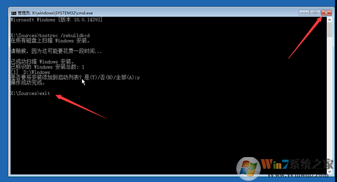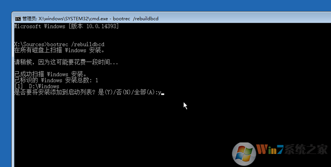 5、輸入命令bootrec /rebuildbcd回車【參考圖片,注意空格】;