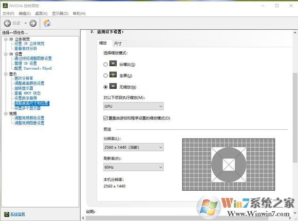 四、右鍵桌面進(jìn)入NViDIA控制面板,然后調(diào)整桌面尺寸和位置中把縮放模式改成無縮放,對以下項目執(zhí)行改成GPU,覆蓋游戲和程序設(shè)置的縮放模式打勾,保存應(yīng)用即可。