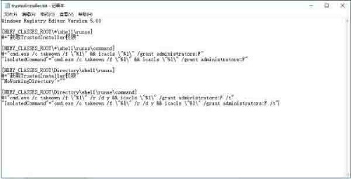 2、將文件重命名為trustedinstaller.txt,將以下代碼復(fù)制粘貼到記事本里;