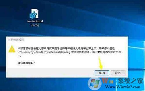 5、雙擊trustedinstaller.reg,提示注冊表信息添加成功。如圖所示: