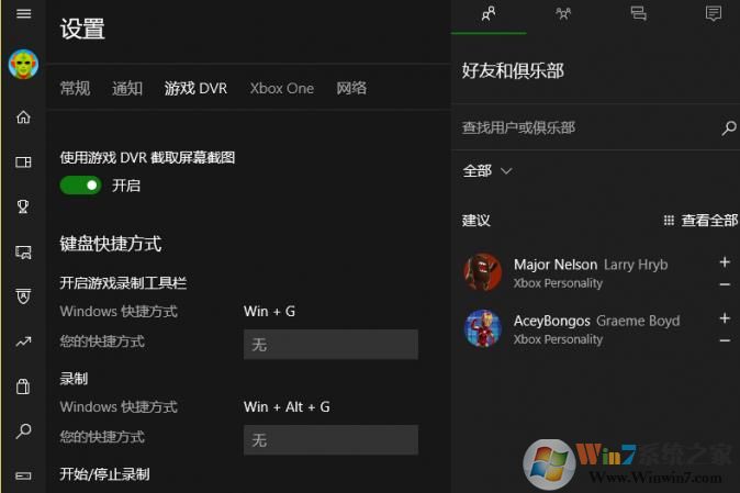 1、啟動Xbox應(yīng)用,在“設(shè)置”窗口選擇“游戲DVR”選項(xiàng)卡,將“使用游戲DVR截圖屏幕截圖”開關(guān)置于關(guān)閉的位置,然后再重新開啟。