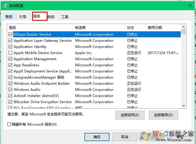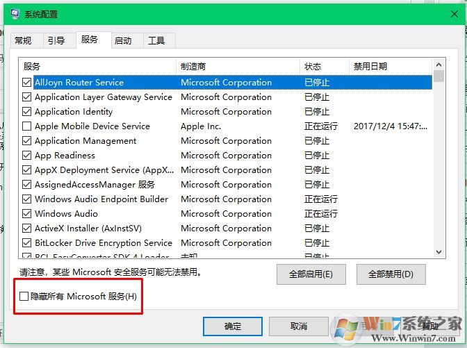 3、點擊隱藏所有的microsoft服務(wù)。因為microsoft服務(wù)也就是我們所說的系統(tǒng)服務(wù),隱藏之后我們就不會禁用到系統(tǒng)服務(wù)了。