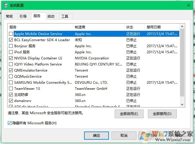 4、將不想要啟動的服務(wù)取消勾選,并點擊應(yīng)用。(如果想要啟動該服務(wù)勾選即可)具體該服務(wù)有什么功能,涉及到什么軟件大家可以自行到網(wǎng)上搜索。