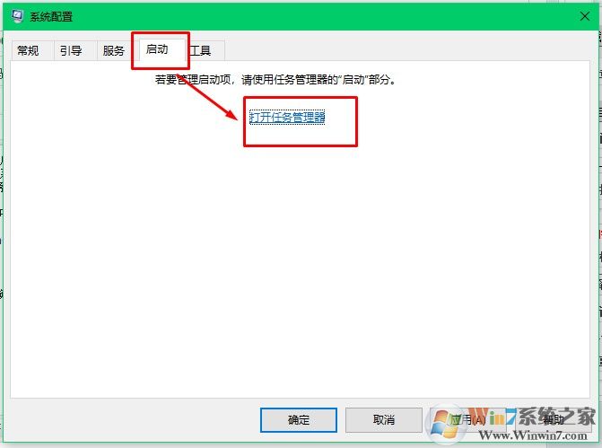 5、切換到啟動選項卡。選擇打開任務(wù)管理器。