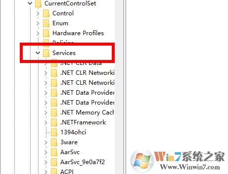 3、在CurrentControlSet的展開項中找到 Services,并將其展開展開。