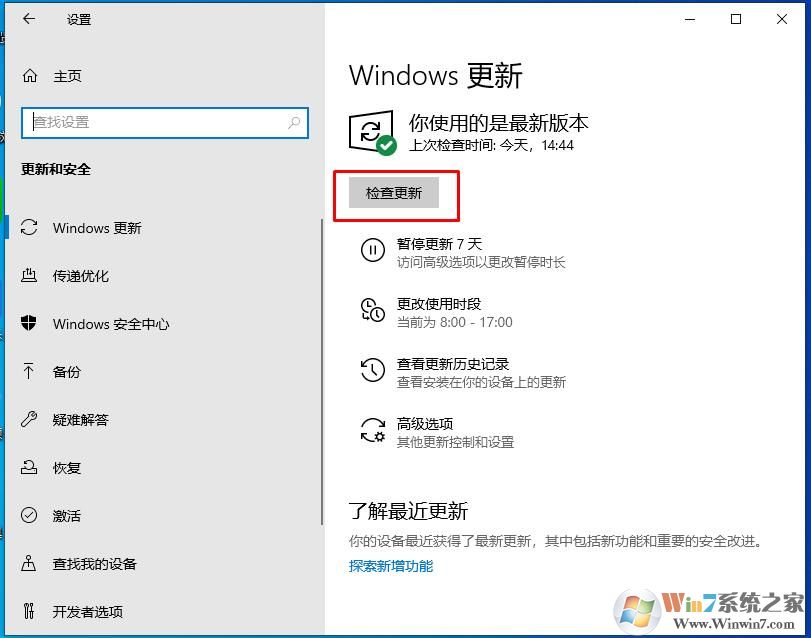 2、打開Windows更新選項,檢查更新(升級到更新的Win10版本)