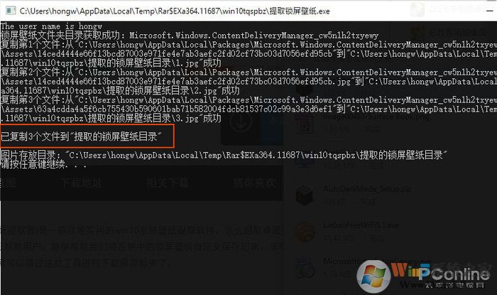 如果需要批量化提取壁紙,可以下載這款名叫“Win10鎖屏壁紙?zhí)崛≤浖?/a>” 的綠色小軟件。下載完成后是一個僅300KB左右的壓縮包,直接執(zhí)行里面“提取鎖屏壁紙.exe”就可以了。稍后屏幕上會彈出一個黑色面板,如果出現(xiàn)“已復(fù)制XX個文件到提取的鎖屏壁紙目錄”則代表壁紙?zhí)崛〕晒?,按任意鍵繼續(xù)就完成了。