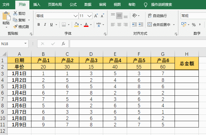 單價(jià)不同,數(shù)量不同,但需要快速求和怎么辦?方法也很簡(jiǎn)單,就是每種商品先相乘后加在一起求總金額,使用公式:=SUMPRODUCT($B$2:$G$2,B3:G3)就可以啦。