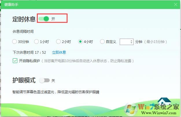 2、把定時(shí)休息關(guān)閉就可以了。如果不想關(guān)閉,可以自己設(shè)置一下時(shí)間,或是取消10分鐘的隱私保護(hù)。