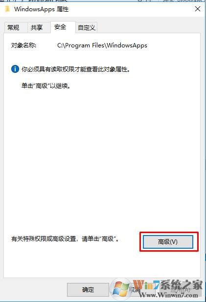 1、首先右鍵點(diǎn)擊WindowsApps文件夾,然后來(lái)到安全選項(xiàng)卡,點(diǎn)擊高級(jí)按鈕;