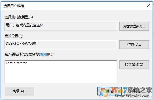3、在選輸入要選擇的對(duì)象名稱里輸入你當(dāng)前登錄的管理員帳戶,如Administrator,也可以點(diǎn)擊高級(jí),然后查找選擇加入;