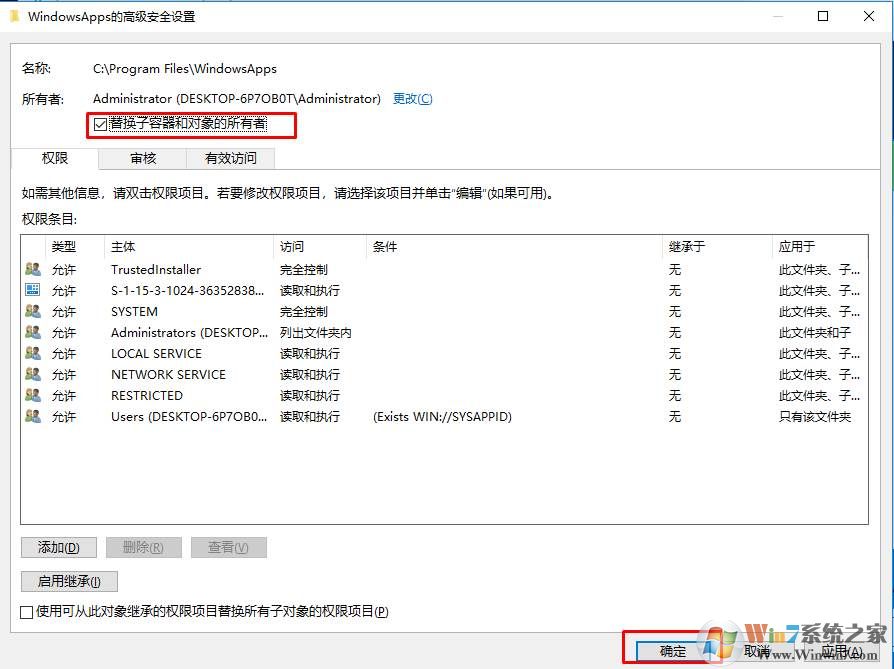 4、確定之后,所有者就變成Administrator了,勾選替換子容器的對(duì)象的所有者(表示里面的子文件夾也一并修改),確定