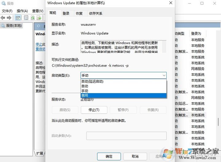 3、然后將啟動(dòng)類型更改為“禁用”,再點(diǎn)擊一下“停止”即可。