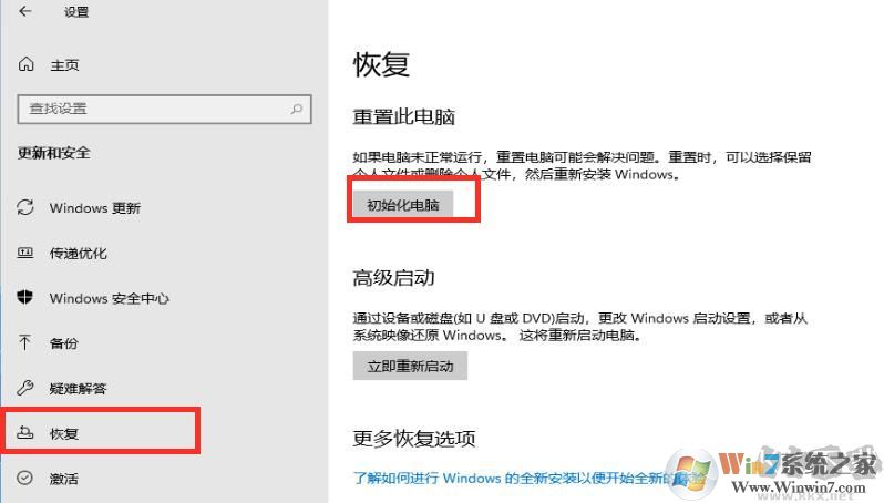 3、點擊左邊的【恢復(fù)】選項之后,在右側(cè)就可以看到重置此電腦的選項啦,點擊初始化電腦;