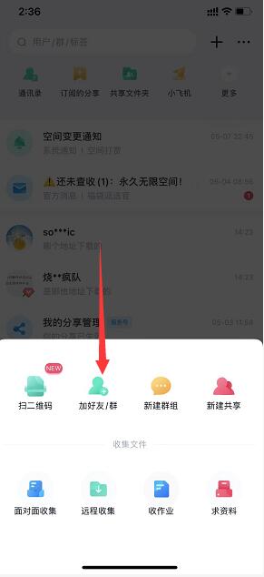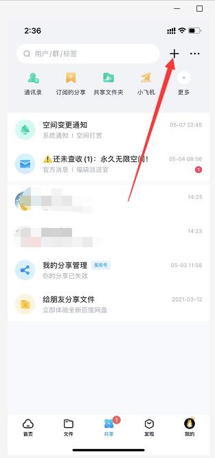 然后點(diǎn)擊“+”號(hào),之后使用掃一掃或是在通訊錄中添加你的百度網(wǎng)盤好友!