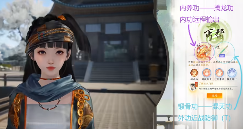 丐幫以棍法和掌法為主的戰(zhàn)斗手段,擁有強(qiáng)大的輸出能力和高防御能力,代表人物為洪七公。丐幫的技能包括“飛龍?jiān)谔?rdquo;“見龍?jiān)谔?rdquo;“潛龍勿用”和“天下無狗”等,這些技能既有攻擊也有控制效果。