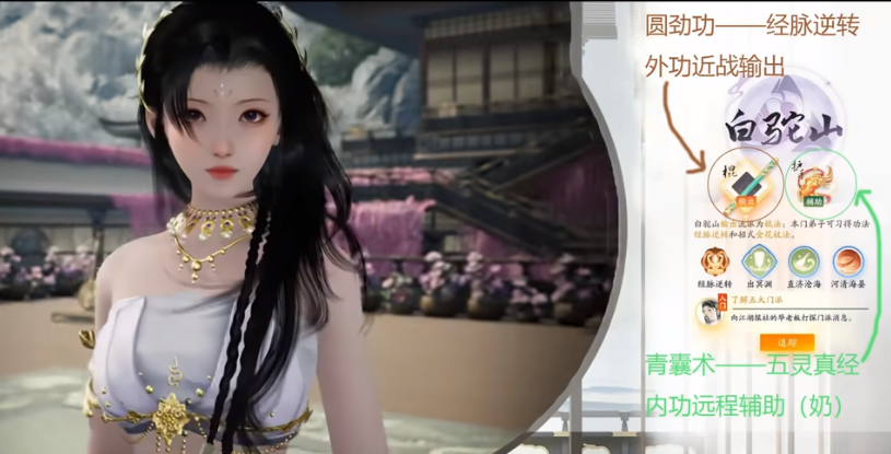 白駝山代表人物為歐陽鋒,使用棍和護(hù)手作為武器。白駝山的輸出能力在終測中表現(xiàn)突出,但缺乏復(fù)活技能,因此在團(tuán)隊(duì)中可能有一定的局限性。